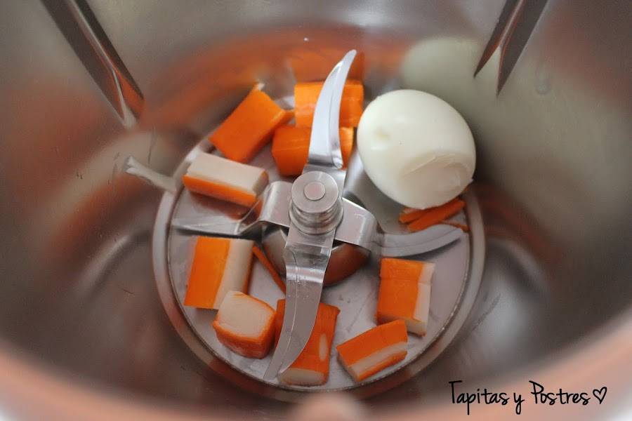 Ponemos los palitos de cangejo y el huevo cocido en el vaso de la thermomix. Tambien los podemos picar a mano.