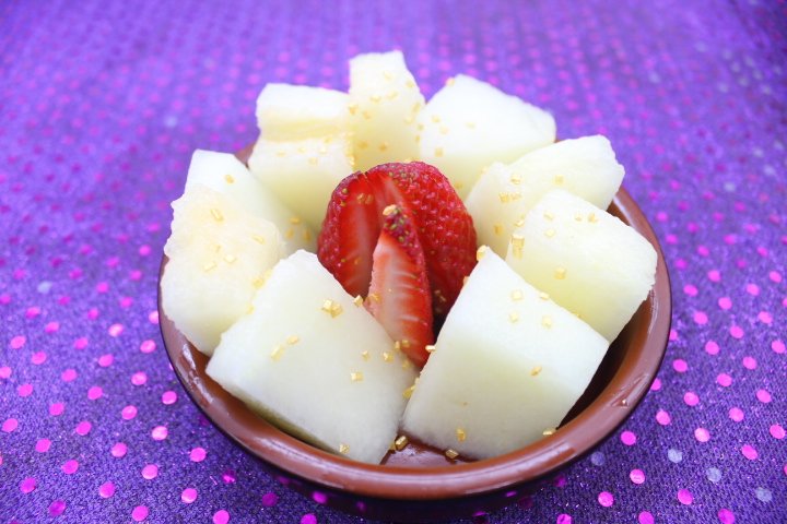 Desechamos la piel y las semillas del melón y cortamos su carne a daditos.