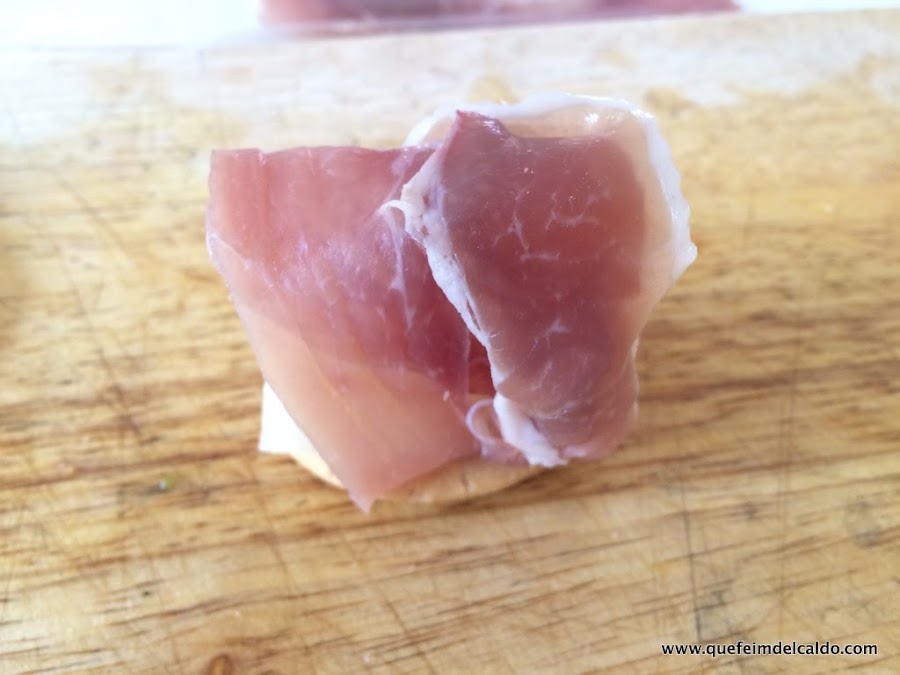 Se pincha con un palillo atravesando el jamón el melón y la galleta.