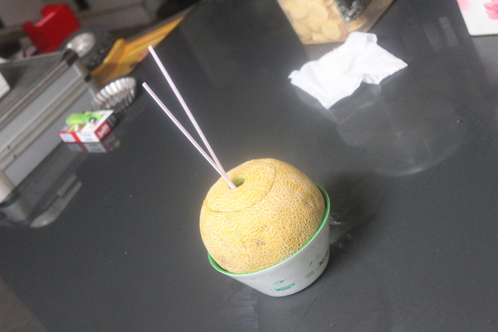 Volcamos este líquido en el melón y terminamos de rellenar con el aguardiente de hierbas.
