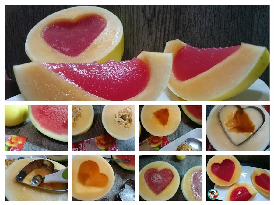 1.- Partimos el melón por la mitad, lo marcamos con el corta pasta con forma de corazón.Le quitamos las semillas al melón, con un sacabolas extraemos la pulpa del melón. Rociamos el melón con el jugo de medio limón.Trituramos con la batidora la sandía, ponemos la gelatina en remojo en agua fría, después calentamos un poco de agua en el microondas y diluimos la gelatina en el agua caliente. Mezclamos todo muy bien. incorporamos la sandía triturada, añadimos el zumo de la otra mitad de limón y, rellenamos la dos mitades del melón con la gelatina. Guardamos en la nevera 5 o 6 horas. Cortamos el melón en trozos y servimos.