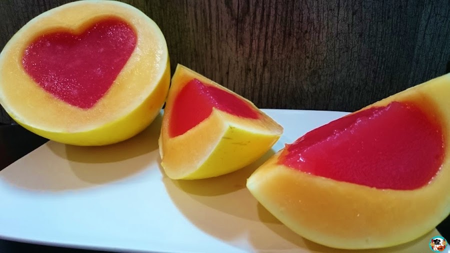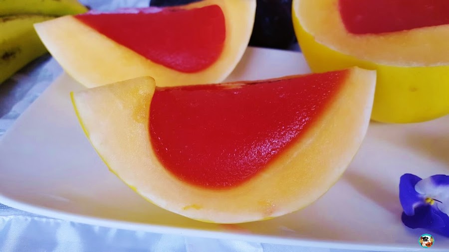 Consejo; rocía con el jugo del limón la fruta para que se oxide. Si quieres que la gelatina se te quede más firme, añade 2 hojas más de gelatina. El postre no requiere azúcar, la fruta si esta madura le aporta mucho dulzor. La receta la puedes hacer a la inversa, rellenar la sandía con el melón. También puedes utilizar otras frutas para hacer rellenar el corazón del melón; fresas, cerezas, frambuesas, kiwi, papaya o leche de coco. Con la pulpa de la fruta que hemos extraído del melón puedes preparar un salmorejo.