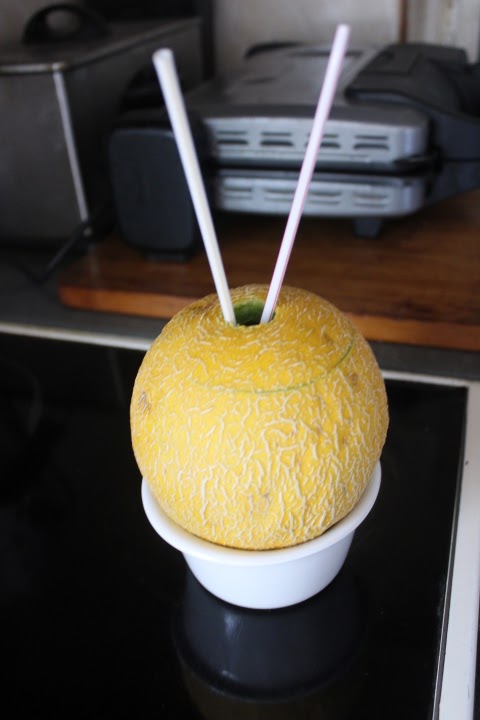Reservamos en la nevera, servimos muy frio con dos pajitas cada melón.