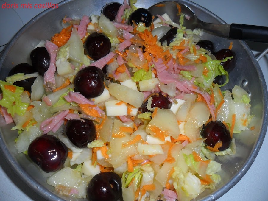 Limpiamos y cortamos muy fino el cogollo de lechuga muy bien centrifugada y ponemos en un recipiente.Agregamos las picotas y jamón dulce a tiras.