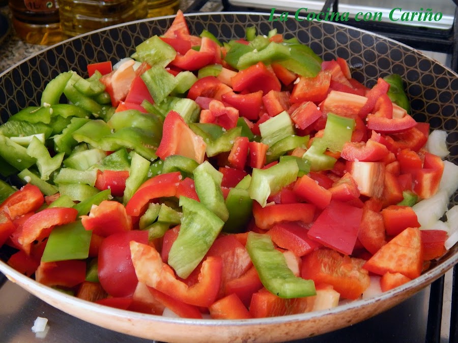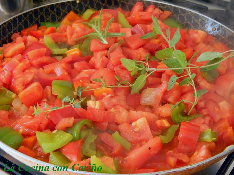 En una sartén colocamos el aceite de oliva virgen extra, el laurel y la cebolla. Añadimos un poco de sal para que sude y al minuto, los pimientos. Los vamos a dejar enteritos, así que pasados tres o cuatro minutos, añadimos los tomates. Salpimentamos, añadimos las aromáticas y dejamos consumir el agua de los mismos, pero no lo convertimos en una salsa de tomate, hemos de encontrar los trozos de verduras.