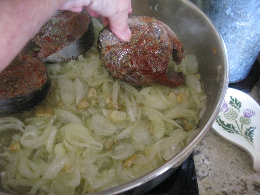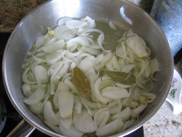 En una sartén, rehogamos el ajo y la cebolla con el laurel hasta que esté blando. Entonces colocamos las rodajas de melva sin enharinar, y las doramos por los dos lados.