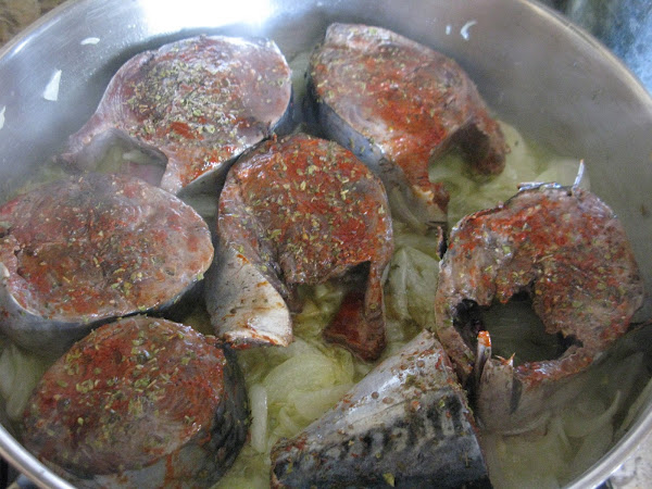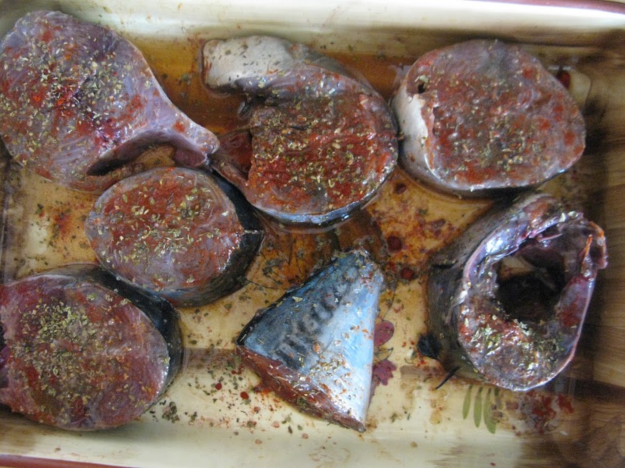 Salar las rodajas de melva y ponerlas a marinar con el vinagre, el pimentón y orégano, una hora más o menos.