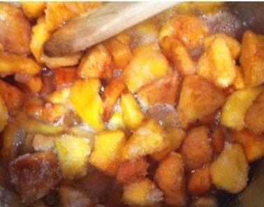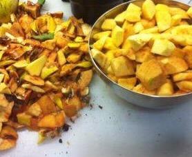 Se lavan bien , se pelan quitando todas las partes feas y se cortan en gajos.Poner en una olla al fuego (honda porque salpica y quema) junto con los demás ingredientes.