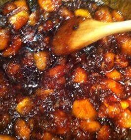 Remover de vez en cuando hasta que se vaya deshaciendo y cambiando de color cuidando que no salpique y que no se pegue hasta llegar a la textura deseada. (Hay quien la tritura pero yo voy aplastando los trocitos poco a poco con una cuchara de madera y queda muy bien.)