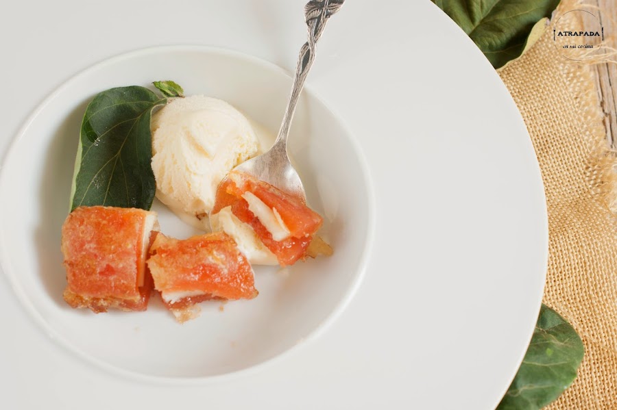 El cambio de estación nos ha permitido dar paso a otros sabores, y si en otoño predominan algunos ingredientes, sin duda uno de ellos es el membrillo. Y la elaboración estrella con el membrillo es la carne de membrillo, de la que os dejaba mi receta hace unos años. Con la carne de membrillo he elaborado un postre que le vi a Su hace ya mucho tiempo. Realmente es una elaboración bien sencilla, que ella acompañó de una crema blanca y que yo he acompañado de helado de vainilla. He usado para la receta un queso semicurado de cabra de Granada, concretamente de Maracena, Las RRR. Y éste ha sido el secreto de la receta, ingredientes de calidad combinados entre sí de forma muy facilita para obtener un postre riquísimo y de temporada.