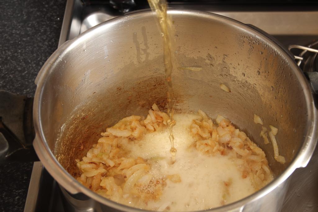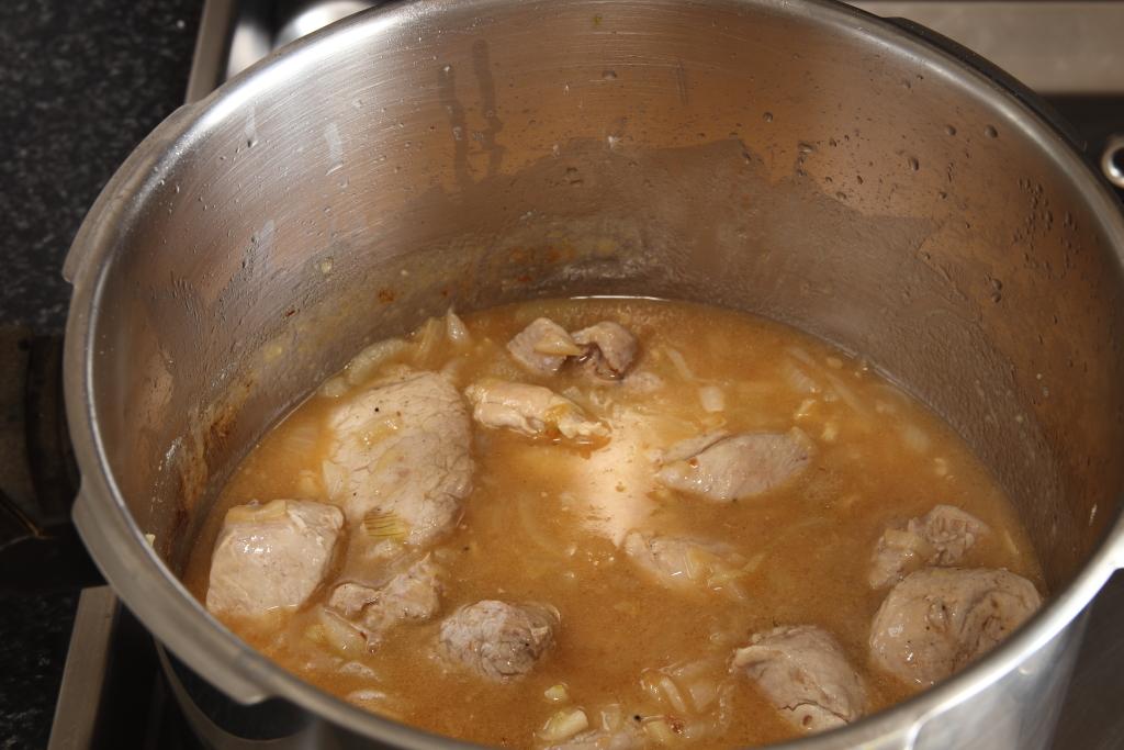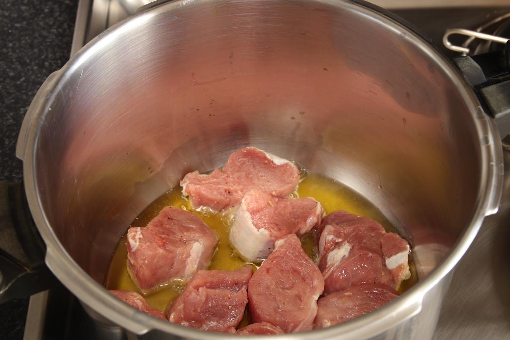 Limpiamos los lomos de grasa (suelen venir ya limpios), cortamos en rodajas un poco gruesas (los hay ya troceados), salpimentamos y reservamos. Ponemos la olla rápida al fuego con un chorro de aceite de oliva y echamos el lomo a sellar, dando la vuelta a las rodajas para que se sellen por todas partes. Una vez sellado retiramos a un plato y reservamos. Picamos las cebolletas y los ajos en daditos, los incorporamos a la misma olla, dejamos pochar hasta que se ablande, removiendo de vez en cuando y añadimos la harina, removemos que se cueza.