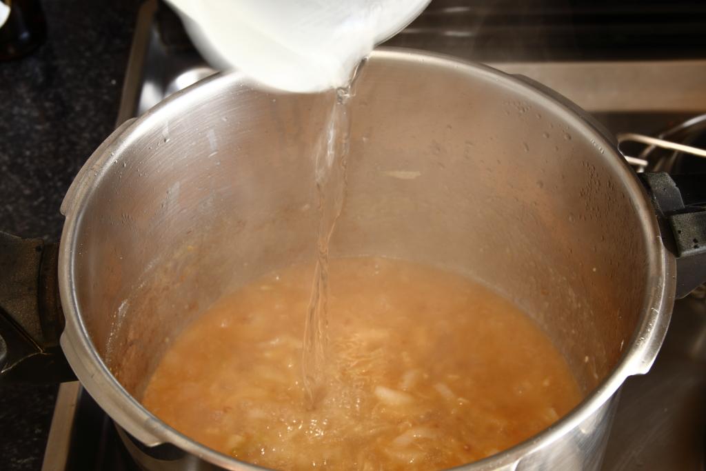 En cuanto podamos abrir la olla pasamos todo a una cazuela baja y amplia, reservamos.