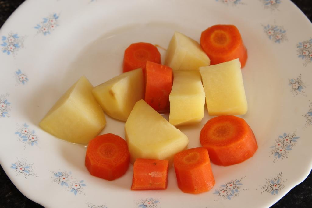 Limpiamos y pelamos las zanahorias, cortamos en rodajas de 2-3 cm y reservamos. Pelamos las patatas, las cascamos en piezas medianas y las pasamos a una cazuela con agua junto con las zanahorias, sazonamos y llevamos al fuego hasta que estén cocidas, escurrimos y reservamos.