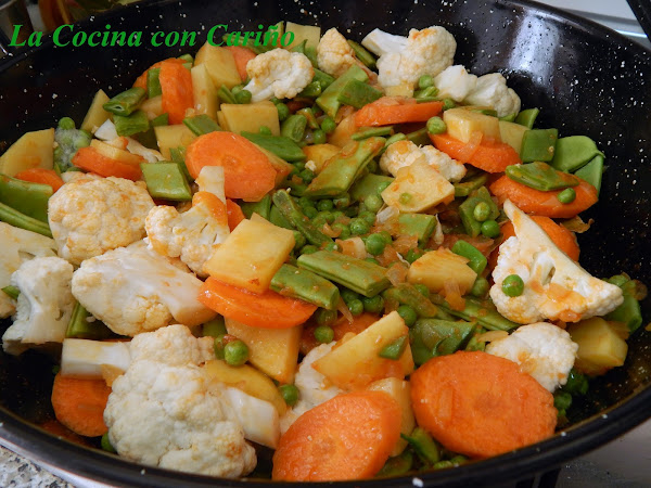 Tan sencillo como eso, una menestra con los productos típicos de la huerta en nuestro querido y bello otoño. En nuestro caso vamos a utilizar, alcachofas, guisantes, judías verdes, zanahorias y coliflor.