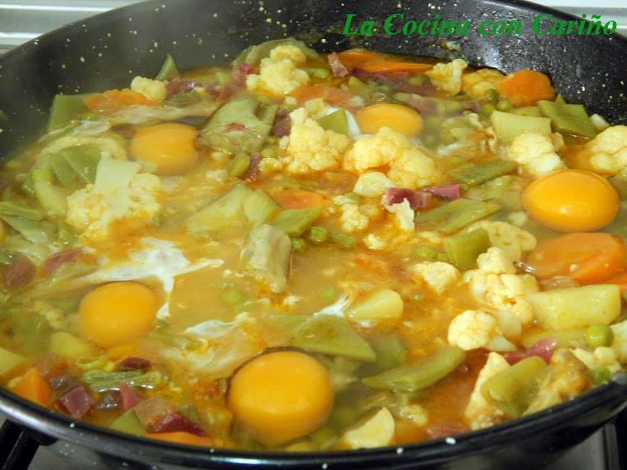 Salteamos el jamón, lo justo, para que no esté crudo, con una cucharadita de aceite de oliva y lo vertemos sobre el guiso. Añadimos los huevos y tapamos. Esperamos unos 5 minutos, aproximadamente. Comprobamos que las claras no estén líquidas. Si aún estuviesen sin hacer, podemos dejar reposar con la tapa puesta un par de minutos y liso. Esto ya es cuestión de gusto