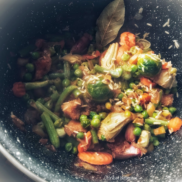 Agrega los pimentones, el laurel y los trocitos de pan. Remueve para que se desprenda el aroma. Puedes echar unos trocitos de chorizo vegetal en el sofrito.