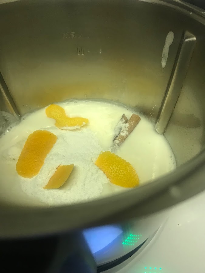 Pon en el vaso la leche, el azúcar la maicena y la harina de arroz y mezcla 10seg/vel4, añade la piel de naranja y la rama de canela