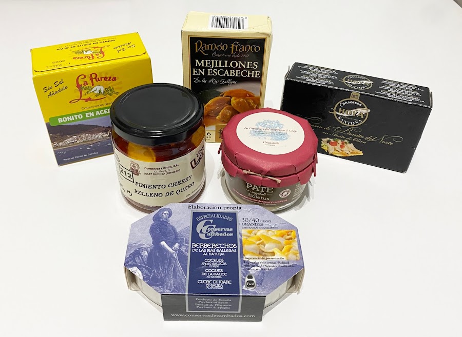 Decidimos pedir varias conservas gourmet como este paté de boletus, pimientos cherry rellenos de queso, ventresca de bonito del Norte, bonito en aceite de oliva, berberechos de las rías gallegas al natural y mejillones en escabeche.
