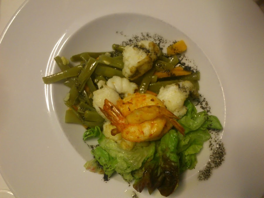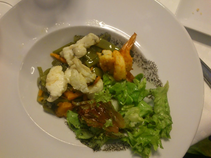 Ensalada de rape y langostinos sobre vainas, con vinagreta de trufas.