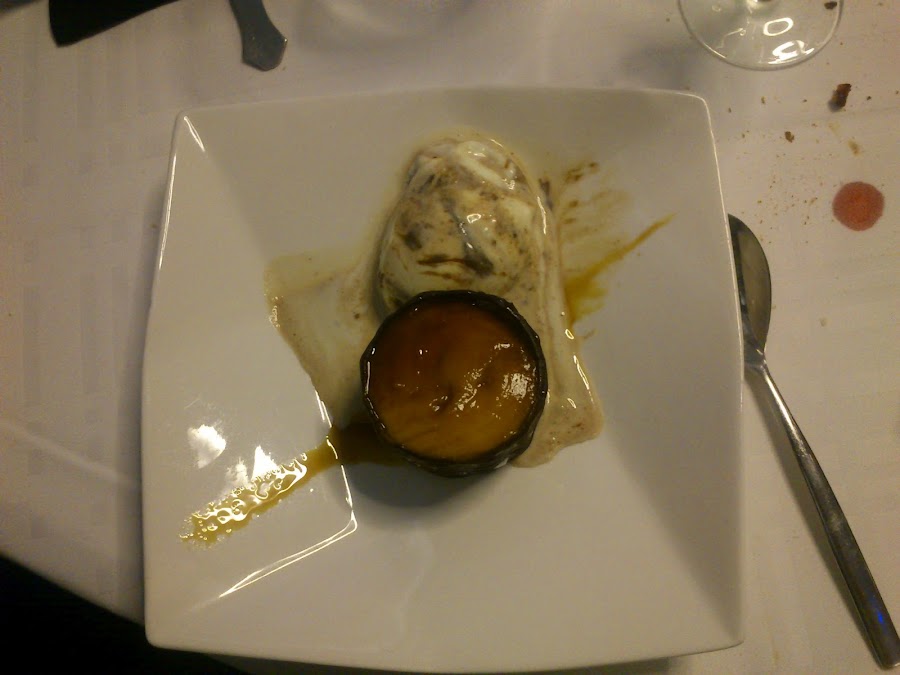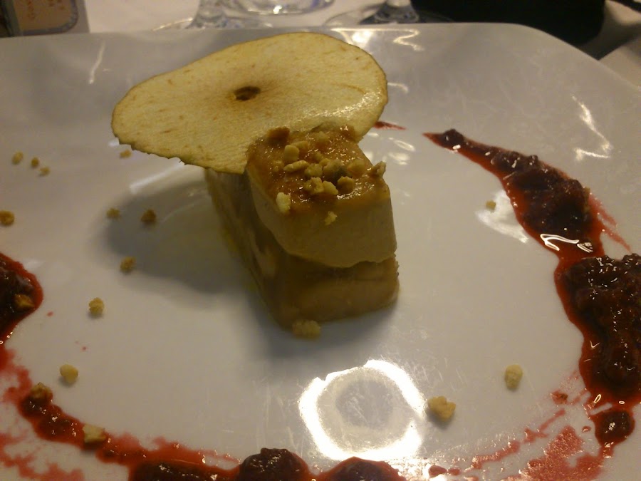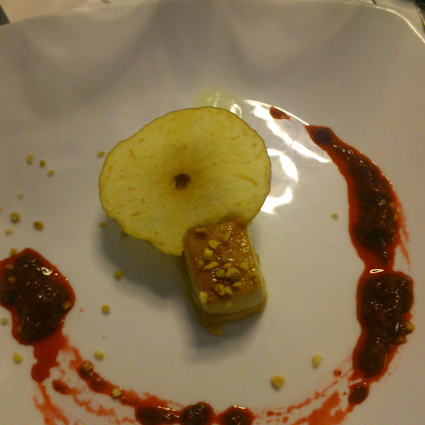 Timbal de foie, crema de queso y manzana asada con caramelo de patxaran y pan de pasas y nueces.