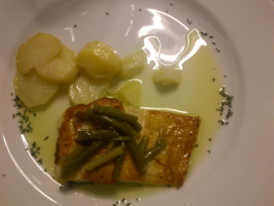 Lubina a la plancha con refito de ajos frescos, jamón, y patatas panaderas.
