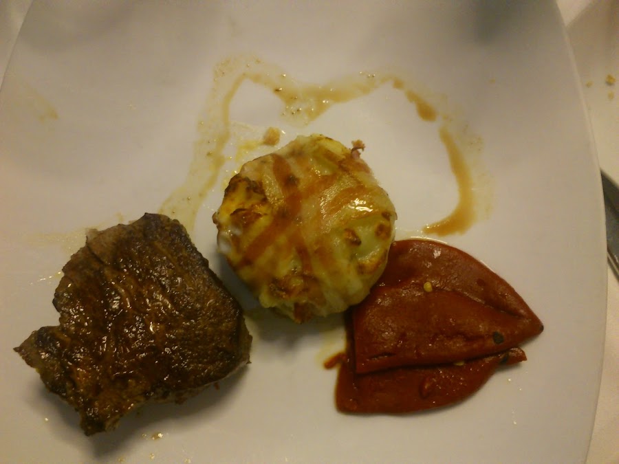 Solomillo a la plancha con terrina de patata bacon y dúo de piquillos. Salsa de oporto e Idiazabal.