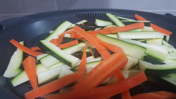 9.- Colocamos la bandeja del varoma con las tiras de verdura reservadas y tapamos, para programar luego 25 minutos, temperatura varoma y velocidad 1.