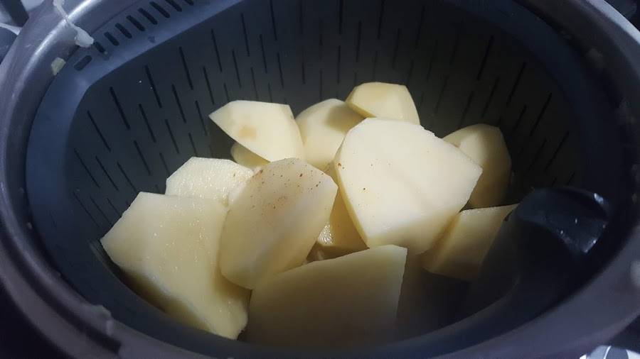 6.- Añadimos el agua y la pastilla de caldo en el vaso e introducimos el cestillo, donde pondremos los centros de calabacín reservado y las patatas en trozos.