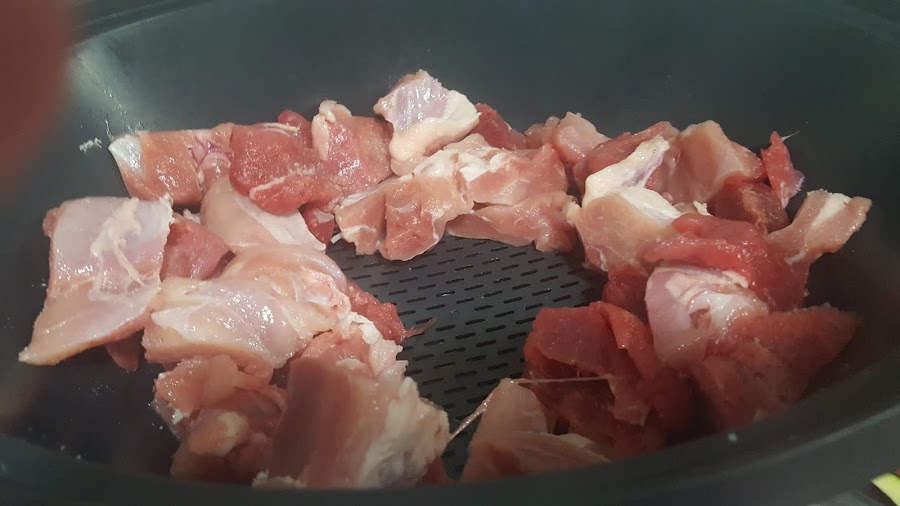 7.- Situamos el recipiente varoma en su posición, pulsamos la tecla balanza y echamos los tacos de pollo hasta que pesen 750 gr.