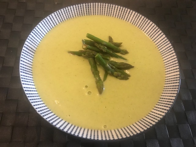 Sirve la crema con las puntas de espárragos de primero, el bacalao regado con la salsa del vaso de segundo.