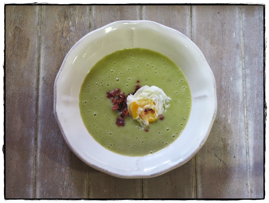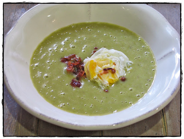 300 grs de tirabeques (yo los he encontrado en Hipercor); 2 patatas medianas; 1/2 l de caldo de pollo; Sal; Picadillo de Jamón; 1 huevo de codorniz.
