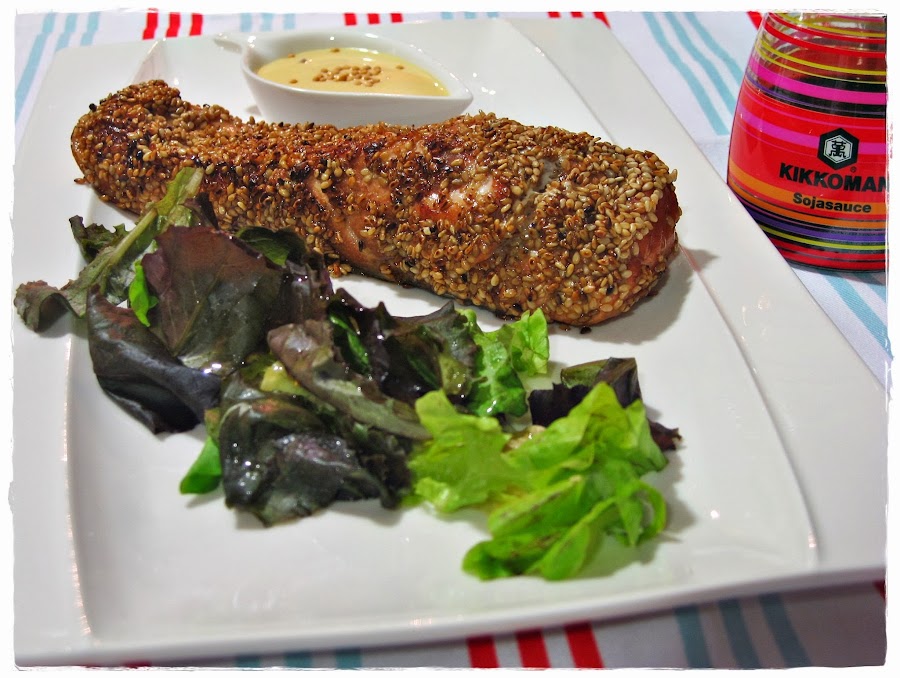 1 lomo grande de salmón fresco cortado en dos trozos; 1 cucharada de salsa de soja Kikkoman; ralladura de naranja y de limón; 2 granos de pimienta de Jamaica (opcional); Sésamo; Salsa de Mostaza y Miel; Ensalada verde para decorar.