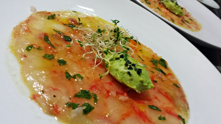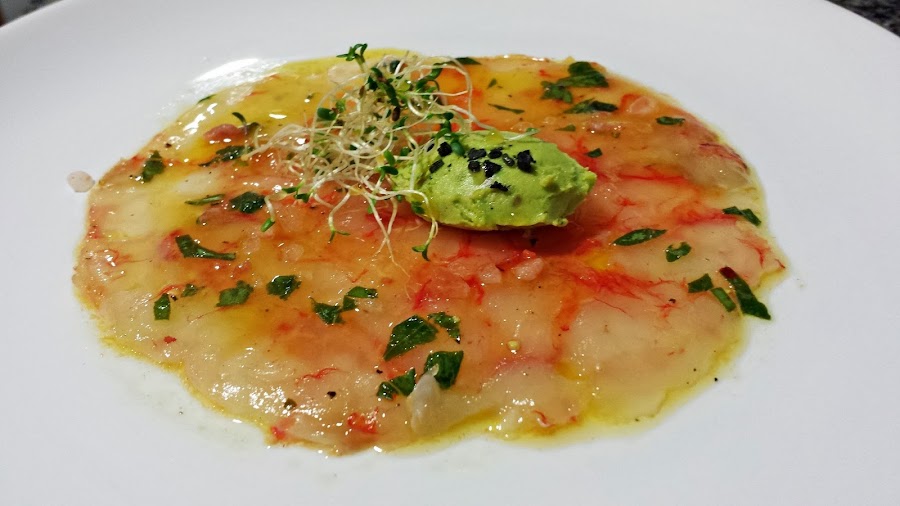 CARPACCIO DE GAMBA ROJA CON HELADO DE AGUACATE