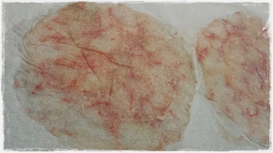 Una vez formados los círculos, cubrimos con otra lámina de papel vegetal y con ayuda de un mazo de cocina, de un rodillo o incluso de un cazo, golpeamos las gambas con cuidado hasta obtener el grosor deseado y siempre dándole forma circular. Debe quedar más o menos así: