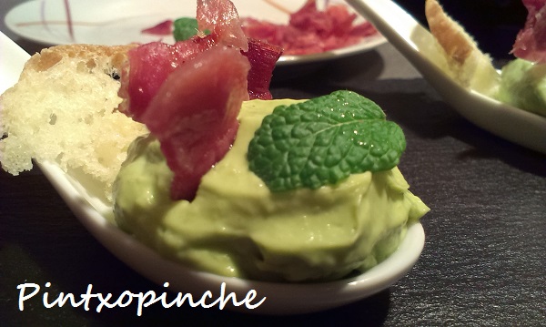 1.- Cucharita de salmorejo de aguacate con jamón crujiente