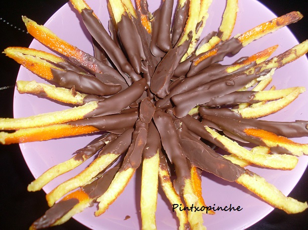 - Piel de naranja confitada con chocolate de cobertura, acompañado de Cava o Champán