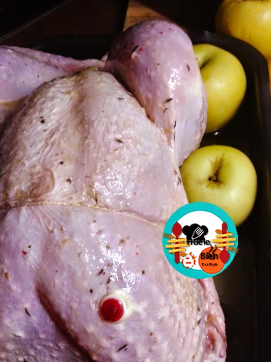 3.- Precalentamos el horno a 200ºC. Cocinamos el pavo 1 hora y media. Cada 30 minutos le damos la vuelta al pavo para que se hace bien por todos los lados. Vertemos sobre él, el jugo que hay en la fuente. Retiramos las manzanas asadas y volvemos a poner otras tres hasta asar las 8.