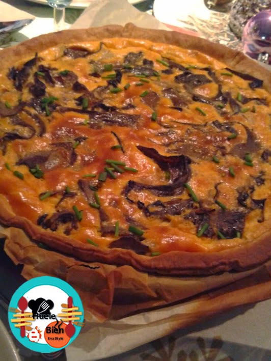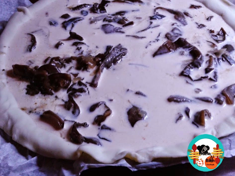2.- Cubrimos un molde con papel de horno, lo forramos con la masa quebrada. Lo rellenamos con las setas. Mezclamos la nata (crema de leche) con los huevos batidos, el tomate, la cucharada de maicena y salpimentamos. Vertemos esta mezcla sobre las setas.