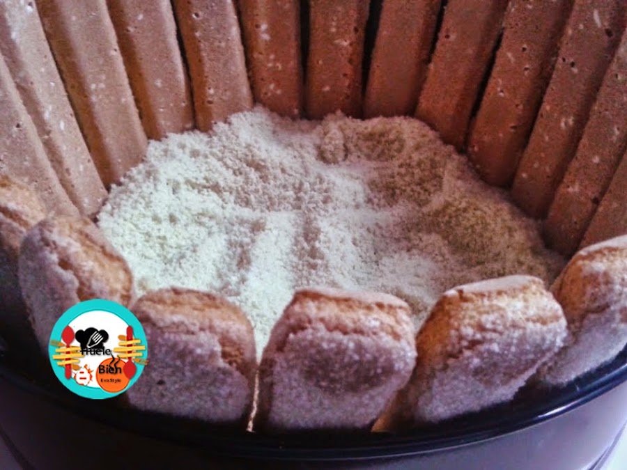 3.- Derretimos el chocolate con un poco de nata (crema de leche) (crema de leche) liquida. Ponemos un poco con una cuchara. Decoramos con las almendras crudas, los cubitos de almendra y los granos de la granada...Retiramos el papel de aluminio y decoramos con la cinta, colocándola alrededor de la charlota. Dejamos reposar en la nevera 1 día antes de servir.