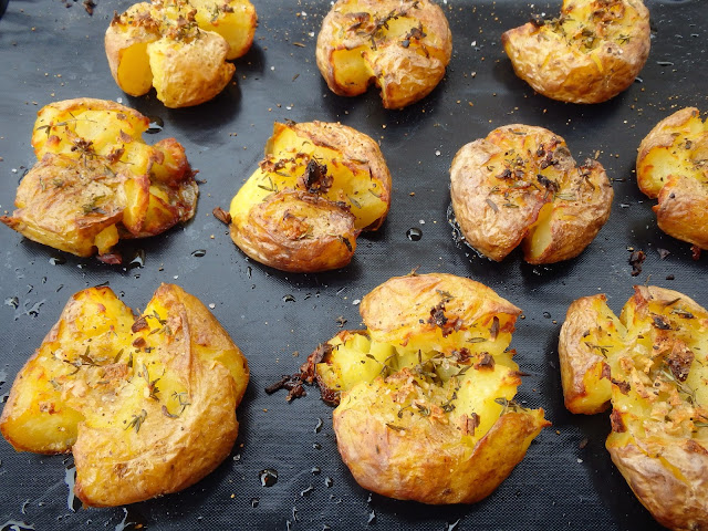 La guarnición del pollo relleno vuelve a ser de mi propio blog, Les receptes que m'agraden, puedes usar unas verduras o setas rehogadas pero yo no renunció ninguna Navidad a estas deliciosas patatas "espachurradas" de verdad que son divinas, en casa me las reclaman año tras año. Són unas patatas espectaculares, por fuera la piel queda crujiente y aromática y por dentro son tiernas y blanditas como mantequilla... ¡Se me hace la boca agua solo de recordar lo buenas que están!
