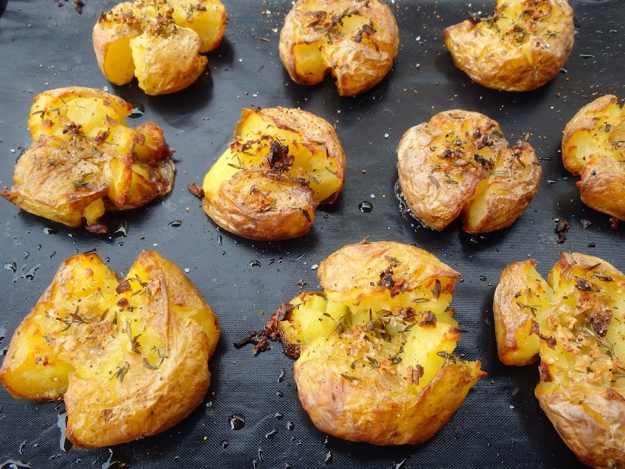 La guarnición del pollo relleno vuelve a ser de mi propio blog, Les receptes que magraden, puedes usar unas verduras o setas rehogadas pero yo no renunció ninguna Navidad a estas deliciosas patatas "espachurradas" de verdad que son divinas, en casa me las reclaman año tras año. Són unas patatas espectaculares, por fuera la piel queda crujiente y aromática y por dentro son tiernas y blanditas como mantequilla... ¡Se me hace la boca agua solo de recordar lo buenas que están!