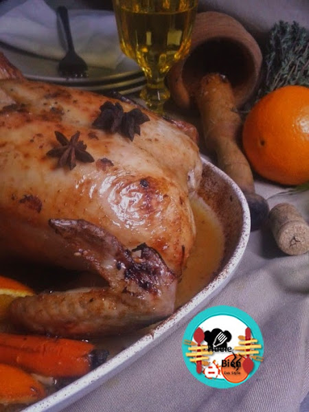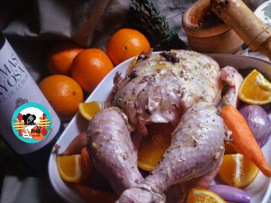 2.- Pelamos las zanahorias y las cebolletas, las ponemos enteras. En una fuente de horno, también el pollo. Partimos las naranjas con la piel en trozos. Ponemos media naranja dentro del ave. Le atamos las patas con hilo de cocinar. Vertemos miel por encima, sal, el tomillo, 1/2 vaso de vino blanco y 1/4 de vaso de Grand Marniert.