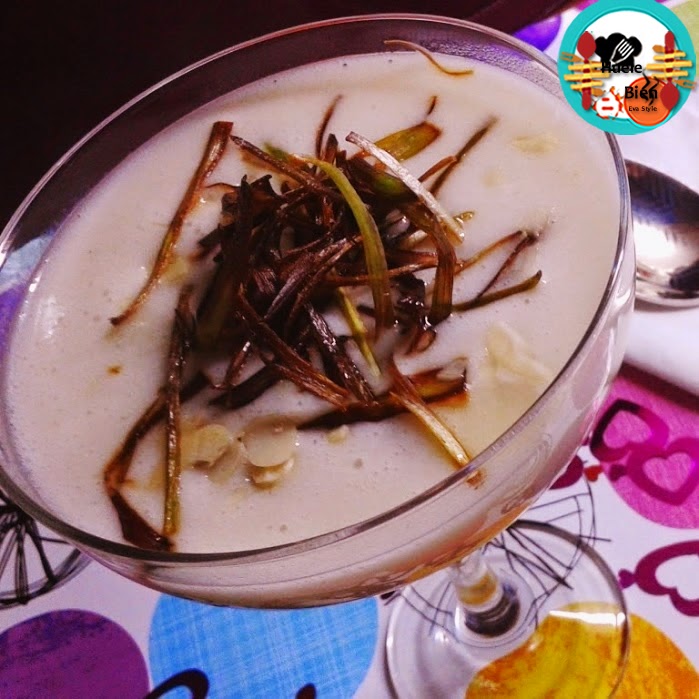 2.- Lavamos el puerro, lo cortamos en tiras muy finas. Lo freímos en abundante aceite caliente. Escurrimos sobre papel de cocina y servimos la crema en copas con el crujiente de puerro, unas gotas de aceite de oliva y unas laminas de almendras.