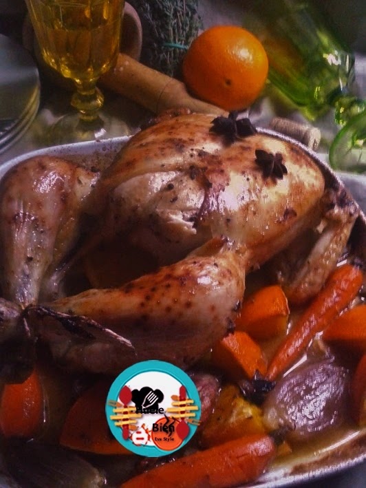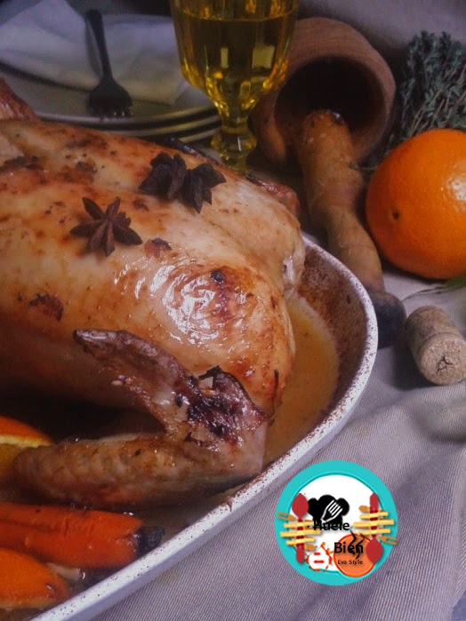 PREPARACIÓN1.- Compramos un pollo entero que este limpio. En un mortero majamos las pimientas, los ajos enteros, con la piel, un anís estrellado y la sal. Mezclamos el majado con la margarina, untamos todo el pollo con ella.