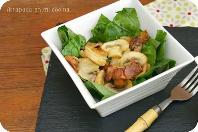 Una ensalada templada de espinacas, champiñones y bacon nos vendrá genial para continuar nuestro almuerzo y antes del último plato.