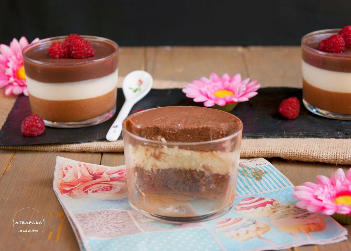 Los más chocolateros triunfarán con el postre, porque estos vasitos de mousse de chocolate negro con crema de vainilla, ganaché de chocolate con leche acompañados de frutos rojos no pueden dejar indiferente a nadie, ni siquiera a mi que no soy muy chocolatera.