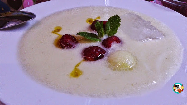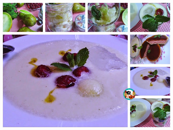 1-. Pelamos las peras. Las troceamos y las ponemos en una jarra grande. Partimos el melón le quitamos las semillas y, con un saca bolas extraemos algunas y reservamos. El resto de la pulpa lo ponemos en la jarra con las peras. Añadimos 1 vaso de agua, un poco de aceite de oliva, 1 pizca de sal y unas hojas frescas de hierbabuena. Lo trituramos todo con el brazo de la batidora. Guardamos en la nevera hasta el momento de servir. Servimos en fría con unas frambuesas, las bolas de melón, unas gotas de aceite de oliva y pimienta molida. Decoramos con una ramita de hierbabuena.