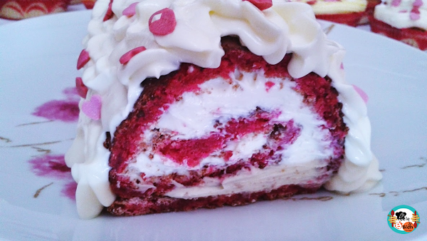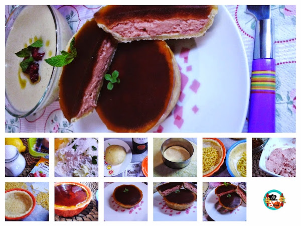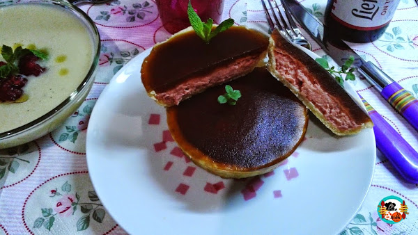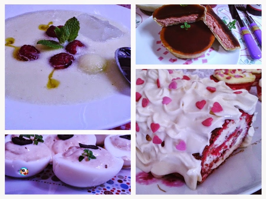 De primero tenemos una sopa fría de frutas; peras y melón con algunas frambuesas, después unos huevos rellenos con yema de huevo y atún. Luego unas tartaletas de paté de pato y pollo con gelatina de crema de Jerez...El postre un rico brazo gitano de aroma de fresa con buttercream de queso.