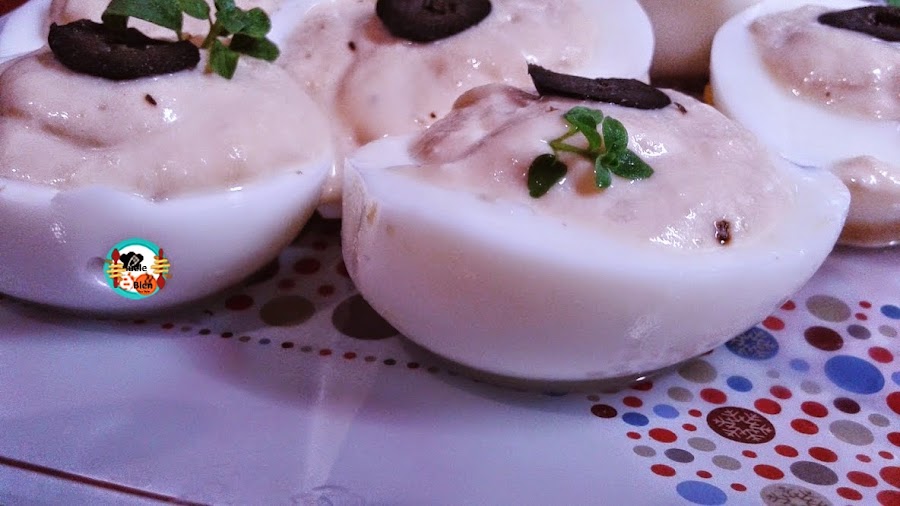 2.- Ponemos a cocer los huevos 8 minutos con agua y sal, los pelamos y dejamos enfría. Los partimos por la mitad y le quitamos las yemas. Batimos las yemas con el atún y le añadimos la mahonesa. Salpimentamos al gusto. Decoramos con una rodaja de aceituna negra y unas ramitas de orégano. Reservamos en la nevera hasta el momento de servir.