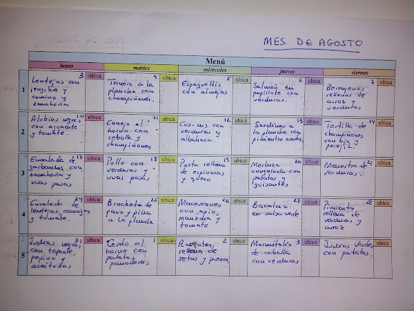 Holaaa agosto!! Ya llegó el mes de las vacaciones, aunque se notaba más cuando éramos pequeños, ahora ya se reparten las vacaciones durante todo el año. Ya va de baja el calor, aunque sea un poquitín, aunque todavía apetecen cosas fresquitas. Vamos a aprovechar lo que queda de solecito, que ya mismo tenemos otoño aquí. Os dejo las ideas de menús para este mes que empezamos, si os ayuda aunque sea ...